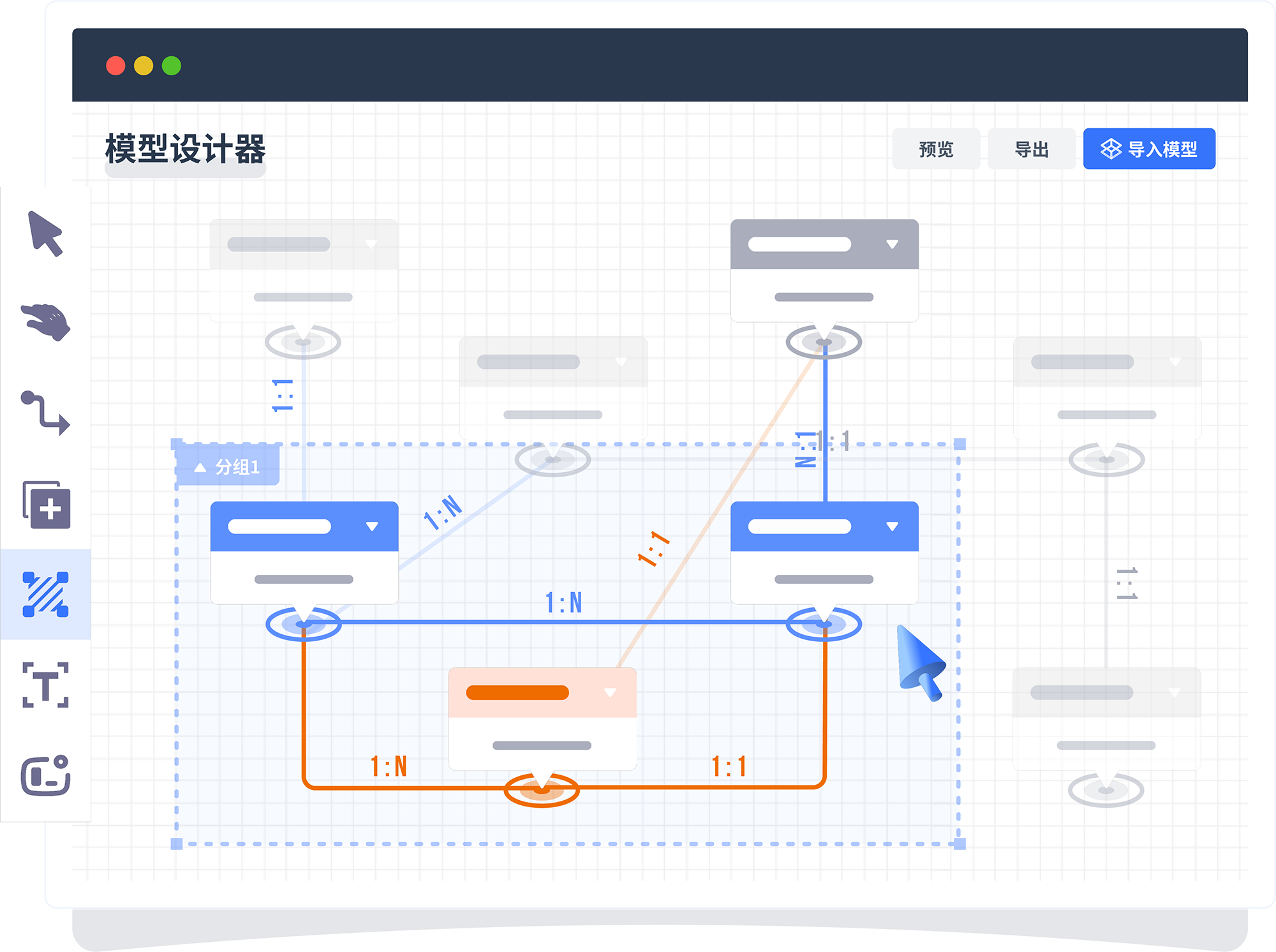 基于用户故事设计业务模型 ,,,采用图形化方式完成er图设计 ,,,支持多层分组 ,,,面向复杂模型也可以条理清晰 ,,,模型支持预览、 、、导入、 、、导出。。。