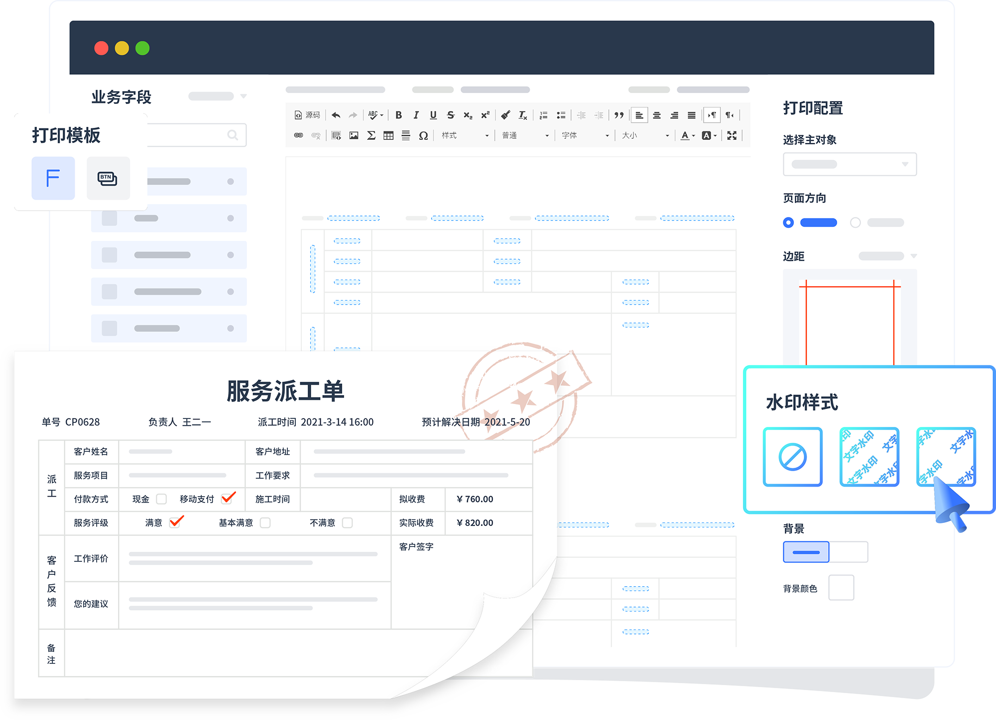 业务场景所需的打印/输出文档也支持自定义 ,,,关联系统内数据支持水印等辅助配置。。。