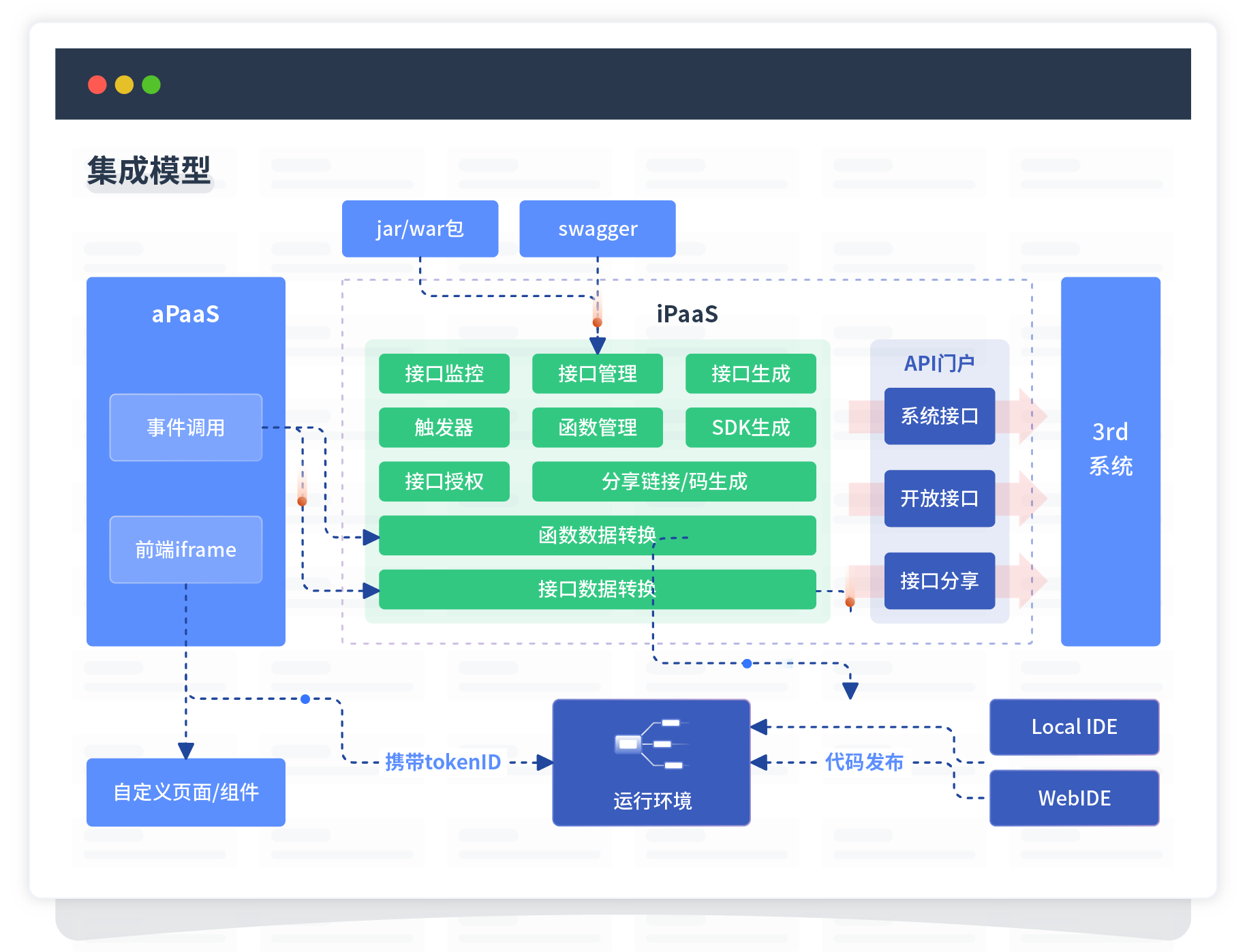 集成模型包括平台本身前、 、、后端能力的扩展 ,,,也支持通过API门户和第三方系统进行交互。。。