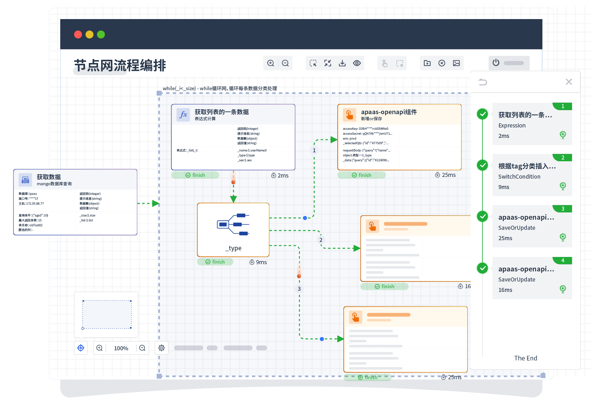 针对集成场景 ,,,组件定义后支持进行流程编制 ,,,不同于传统代码方式 ,,,通过图形化展示 ,,,支持在线调试、 、、日志查看和运行回放。。。